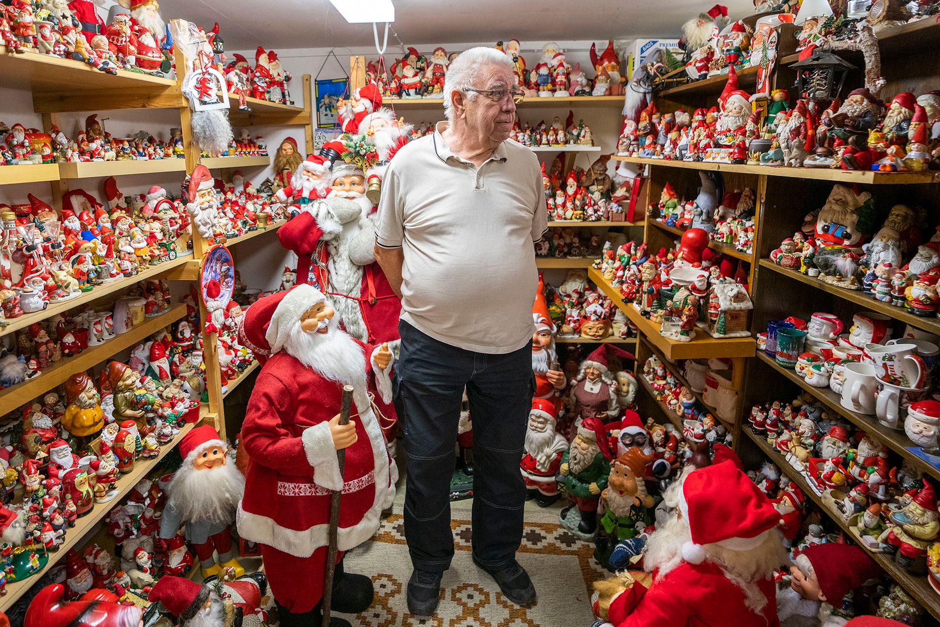 Det är som att gå in i en julprydnadsbutik i två rum, sprängfylld med tomtar i alla storlekar – från den väldiga Coca Cola-tomten i papp, till små tomtar i porslin, keramik och plast. Däribland några verkliga klenoder.